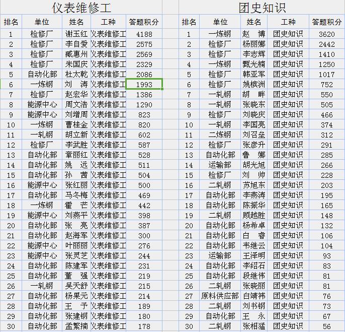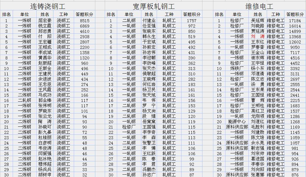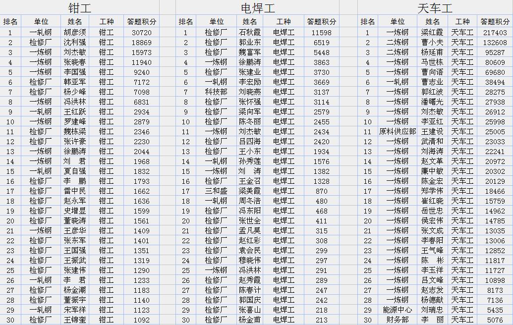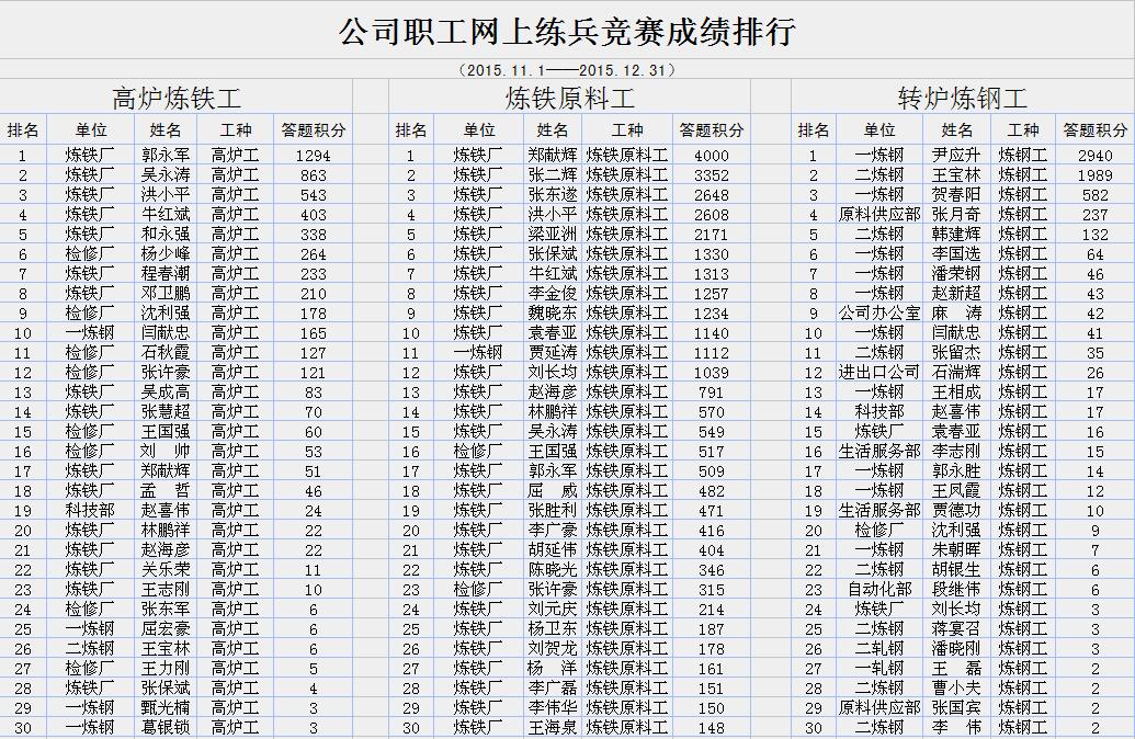 公司将于近日举办第三次职工网上练兵双月赛(积分统计时间11月1日0时—12月31日24时)。请高炉炼铁工、炼铁原料工、转炉炼钢工、连铸浇钢工、宽厚板轧钢工、维修电工、钳工、焊工、天车工、仪表维修工、团史知识等十一个工种双月成绩排行前30名的同志相互转告,认真准备,力争取得优异成绩。