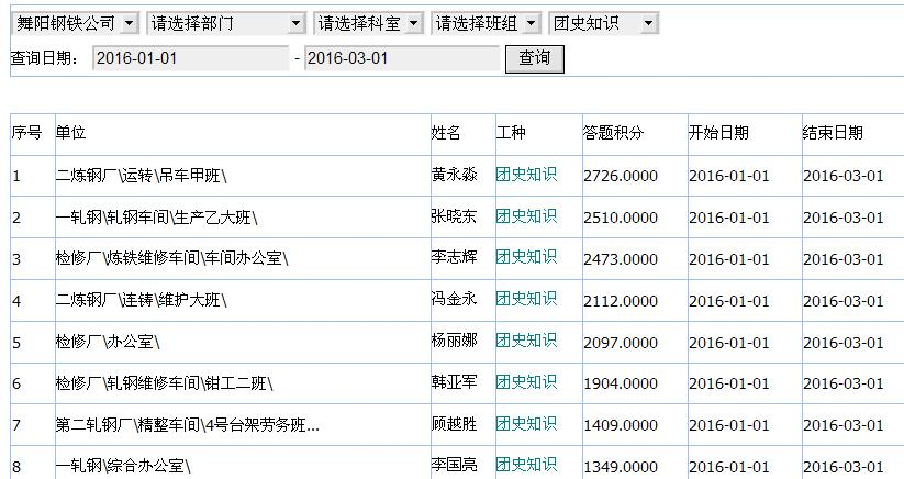 第四步:按工种、时间区间查询当前积分获取和排行情况。